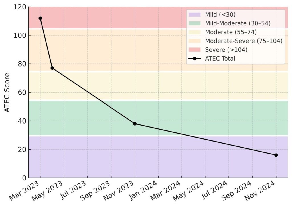 - ATEC: pasó de 112 (autismo severo) a 16 (autismo leve) → reducción del −85,7%