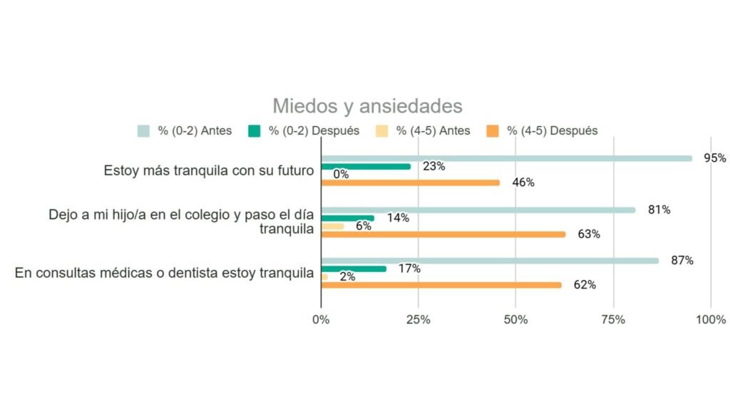 Los resultados de este bloque ponen de relieve que el acompañamiento del que disfrutan durante su participación en los programas contribuye de manera decisiva a la reducción de la ansiedad anticipatoria y del miedo constante, permitiendo que las madres vivan su día a día con una mayor sensación de calma, estabilidad y confianza. Esta disminución del estrés sostenido repercute directamente en su salud mental y en la calidad de vida de toda la familia.